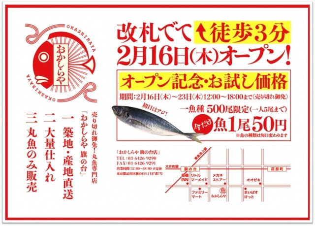 水産物の卸・小売を手がけるベンチャー企業の株式会社フーディソン(東京都中央区 代表:山本徹、以下フーディソン)は、2017年2月16日(木)に丸魚のみを販売する新業態の鮮魚店 「おかしらや 旗の台」を旗の台駅から徒歩3分の立地(東京都品川区旗の台4丁目7番地7号)にオープンします。
