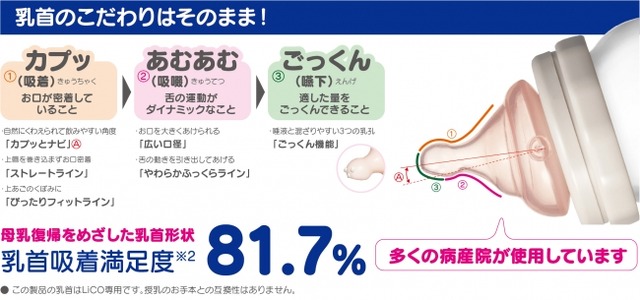 テテオ「授乳のお手本」シリーズは、赤ちゃんが母乳を飲む時のお口の動きを最大限引き出すことを目指した乳首形状を採用しています。新製品「授乳のお手本 LiCO(リコ)」はその良さを引き継ぎながら、従来品よりもお買い求め頂きやすい価格を実現し、お手軽にご使用いただけます。