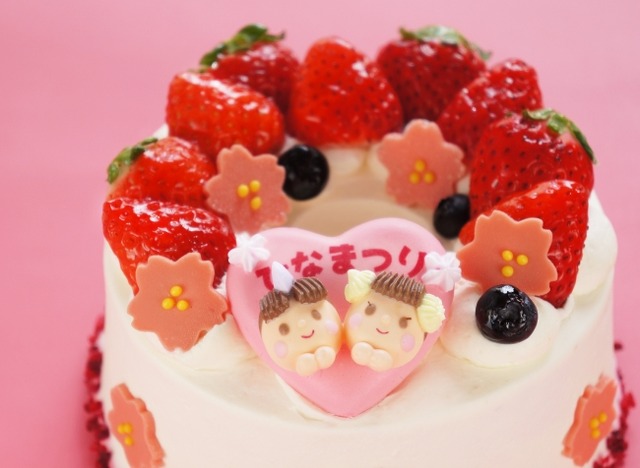 ふわふわの苺シフォンに旬の苺をたっぷりのせて、お内裏様とお雛様の砂糖菓子を飾り付けました。
