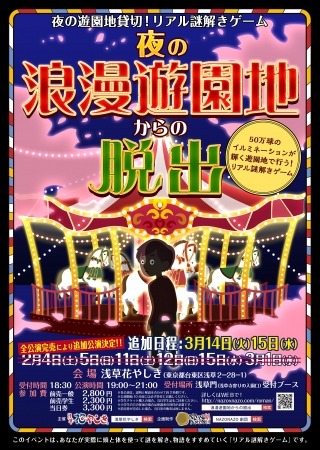 「日常を冒険に変える」をテーマに、リアル謎解きゲームを全国で展開し、通算5万人以上を動員したNAZO×NAZO劇団(合同会社ハレガケ)(本社:東京都豊島区、共同代表:黒田洋介/平岡雅史)は、浅草花やしき(東京都台東区浅草2丁目28−1)と共同で、閉園後の夜の遊園地を貸切にした、好評開催中の体感型リアル謎解きゲーム第5弾「夜の浪漫遊園地からの脱出」を2公演追加販売する。