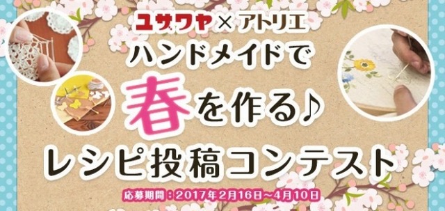 エキサイト株式会社は、18,000作品が掲載されているハンドメイドレシピ投稿サイト「アトリエ」で、手作りホビー材料の大型専門店を展開するユザワヤ商事株式会社(東京都大田区 代表取締役社長 畑中喜雄、以下ユザワヤ)と共同開催する「ハンドメイドで『春』を作る♪レシピ投稿コンテスト」の作品投稿を、2017年2月16日(木)から開始いたします。