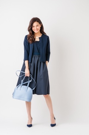 オールネイビーのドレスながら、トップ・ウエストベルト・スカートと色味の異なるネイビーを組み合わせたカラーブロックが新鮮なドレス。