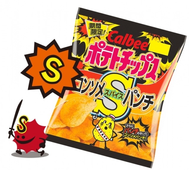 『ポテトチップス コンソメSパンチ』は、「ポテトチップス コンソメパンチ」のコンソメ風味をベースとして、胡椒や山椒などのスパイスを追加しました。濃厚でうま味のあるコンソメ味に、スパイスをピリッと効かせています