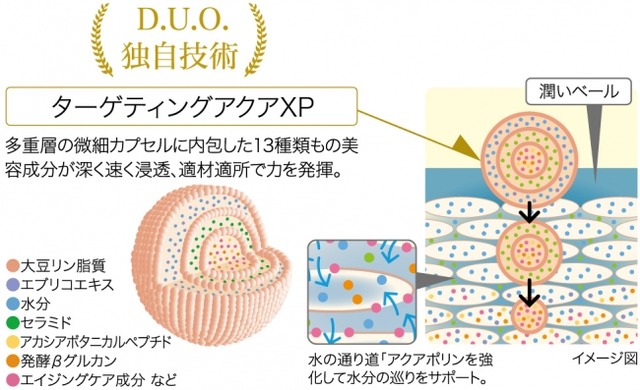 細胞膜と同じ構造の高純度リン脂質で作られた多重層ナノカプセルに13種もの美容成分を配合。従来の約半分サイズまで微細化し、より角質層深く早く届けることに成功。また、D.U.O.独自の多重層ナノカプセル「ターゲティングアクアXP」そのものがベースに作られているから、優しさと効果を両立。乾いて弱ったキメに美容成分がダイレクトに届きます。