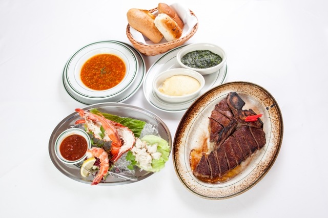 シーフードプラッター / 本日のスープ / プライムステーキ / マッシュポテトとクリームスピナッチ