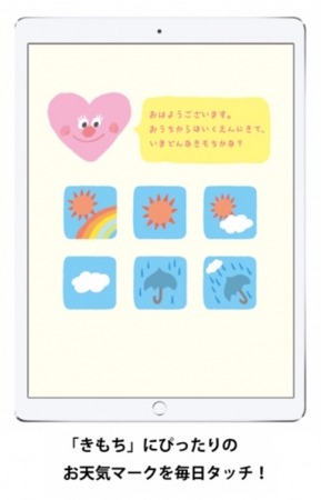 「キッズコンケア」は、iPadに表示される6つの天気マークから自身の「きもち」に近いものを、園児に選んでタッチしてもらう簡単なシステムです。