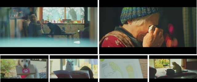 動画には、長野県の山奥に住む一人暮らしのお婆さんと2匹の猫が登場。亡くなったお爺さんとの写真を見て悲しむお婆さんの傍で、2匹の猫はなぜか急に猫専用の通信講座「ユーニャン」の勉強を始めます。ユーニャンは「2本足での立ち方」「しっぽの振り方」「肩の揉み方」などが猫の肉球で書かれたテキストで解説されていたり、DVDでも学べる内容となっており、2匹の猫は日々、勉強を続けます。