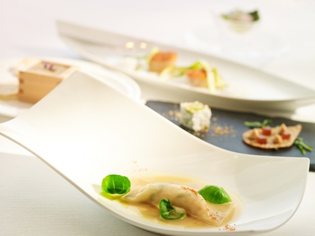 ココナッツオイルのラビオリ、海老のブイヨン、カルーア