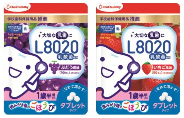 「L8020乳酸菌 チュチュベビータブレット いちご風味/ぶどう風味」は、口腔内のむし歯菌、歯周病菌の抑制に効果的なL8020乳酸菌を手軽に接種することが出来るタブレットです。お子様に人気のいちごとぶどうのフレーバーを採用し、パッケージも従来のものから新しいものに変更しました。