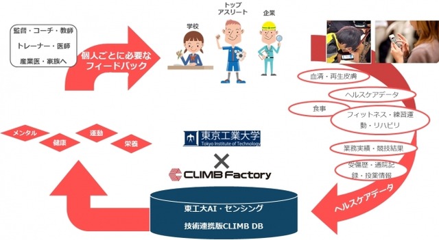 弊社サービス『CLIMB DB』を通して、疲労度判断、怪我の予防、適正な日常生活への助言、メンタル指導など、より高度化したソリューションを提供します。例えばユーザーが食事の内容を『CLIMB DB』に記録しておくと、過去の日常生活や食生活の分析から、それぞれの場面で位置情報を取得し、適切な栄養指導が自動的にユーザーのスマートフォンに届くようになります。ノーベル賞受賞研究者も創出する国内最先端研究機関の東京工業大学が民間への応用技術を開放し、国内外産業の活性化に着手します。まずは東京五輪を前に活性化が見込まれるスポーツ分野を皮切りに、高年齢化社会などの対策など、幅広く健康産業の活性化に寄与する分野に連携を深めていきます。