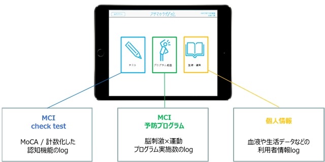 本製品は軽度認知障害(MCI)の早期発見テストと認知症リスク低減運動プログラムを併せて実施することができる構成になっており、プログラムを実施する利用者の情報を保管・蓄積する仕組みになっています。