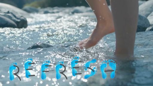 靴を脱ぎ、裸足で入りだす女性。勢いよく素足で川に入ると「REFRESH」の文字が浮かびます。