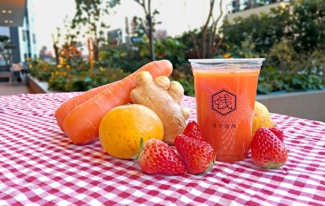 「+いちご、レモン」、スパイシーさが加わった「+しょうが、柑橘」の3種のジュースメニューでお楽しみいただけます。いずれも、浅草農園ならではの厳選食材をヒューロムスロージューサーを使って搾ることで、食材そのものが持つ味と栄養を損なうことなく味わう事ができます。