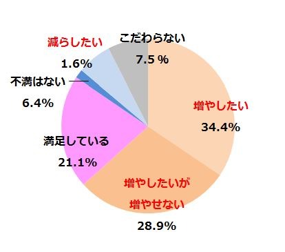 まず初めに、自身の「睡眠時間の改善」について調査をしたところ、63.3%もの人が「睡眠時間を増やしたい」という回答をいたしました。これは、「睡眠」の満足度の調査結果である、睡眠に対して「不満」と回答した64.1%とほぼ数値が一致しています。睡眠に不満がある方が、睡眠時間が不足しているという意識が高いことがわかります。