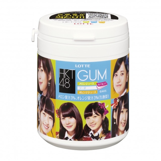 1. 2011年に誕生し、福岡を拠点に活動している人気アイドルグループ「HKT48」の主要メンバーがデザインされたフルーツアソートボトルガムです。