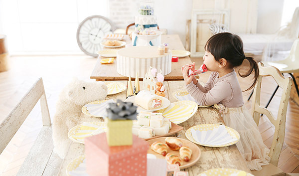 昼寝も場所見知りの心配も必要なし。機嫌の良いタイミングで撮れるのでママも安心、いつもの笑顔を収めよう。ワインやおつまみを食べながら&小道具も子供用ドレスも使い放題で、楽しい雰囲気の中で子供もリラックス。