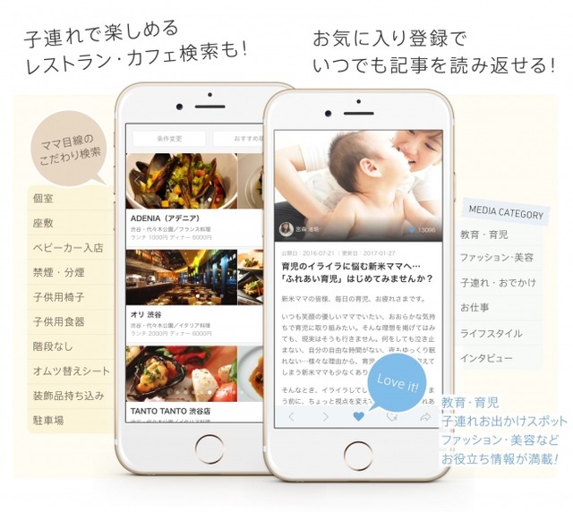 【MAMAPLA】は「教育・育児/ファッション・美容/子連れ・おでかけ/お仕事/ライフスタイル/インタビュー」の6カテゴリーで、忙しいママ達がすきま時間で読める記事を毎日配信しています。更新情報を毎日定時にプッシュでお知らせし、ユーザーママとのコミュニケーション強化を図ります。