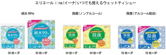 毎年の感染症・食中毒報道等により、身の回りの除菌や住環境のふき掃除に使い捨てのウェットティシューを使用したいと考える生活者が増えています(当社調べ)。「エリエールi:na(イーナ)いつでも使えるウェットティシュー」は、たっぷり大容量で多枚数を使用する部屋の掃除や外出先での手拭き、テーブルふき等、様々な場面で頼れるウェットティシューです。自分のライフスタイルに合わせて選べる純水99%、除菌(ノンアルコール)、除菌(アルコール配合)の3タイプの品揃えで、平成29年3月21日より新発売します。