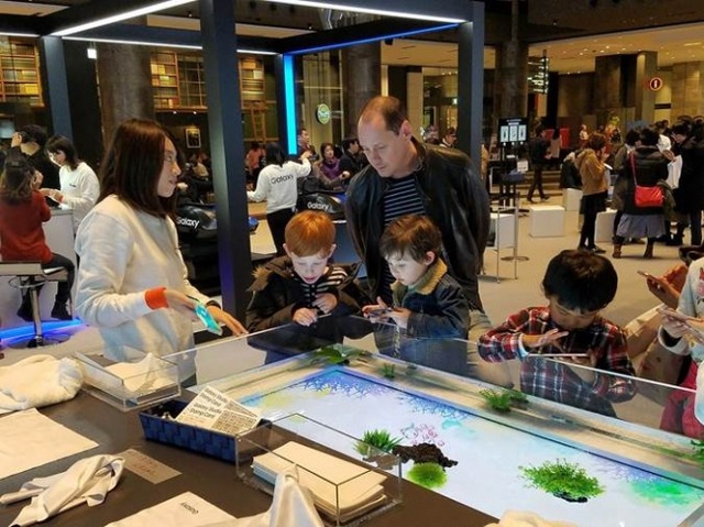 スマホの防水機能を活かし、スマホ画面上で魚を描き、スマホを水の中に浸けると、自分が描いた魚がスクリーンの中で動きだすコンテンツは子どもから大人まで楽しむことができます。