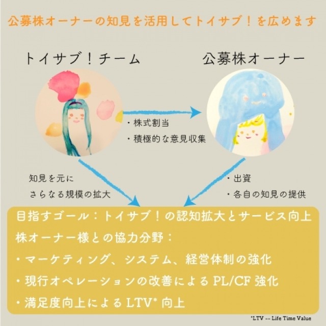 トイサブ!はIT企業出身の代表とベビートイ・インストラクターの2名で主に推進してきました。コンシューマー・マーケティング、財務会計、経営戦略、物流など今後の拡大には幅広いノウハウが必要であるものの、ノウハウを持つ高度な人材を採用するには十分な資金がありませんでした。そこで外部から知見を得るため株主を公募し経営及びその他領域のアドバイザーとして参画していただき、共にトイサブ!を拡大していく事を検討したところ、トイサブ!の会員様には高度な知見を持つ親御様が多くいることがわかったため、Webによる一般公募も含めた第三者割当増資を「株オーナー制度」と呼び、実施することにいたしました。