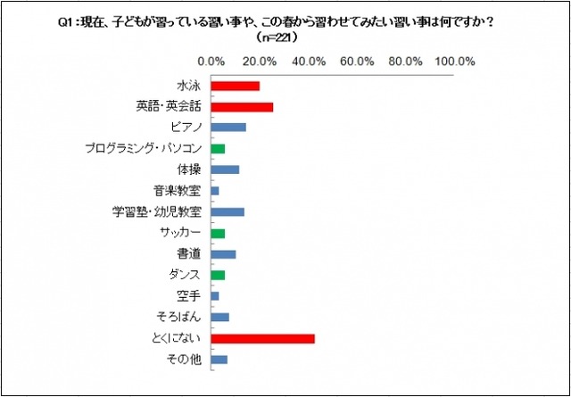 「子どもが現在習っている、あるいは、この春から習わせてみたい習い事」の第1位は「英会話」で25.3%。第2位は「水泳」で19.9%という結果に。一方、42.5%のママたちは、「とくに習わせる予定はない」と回答しました。