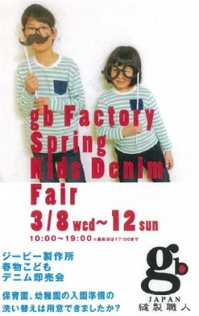 岡山県のアンテナショップ「とっとり・おかやま新橋館」では、3月8日(水)から、「春物こどもデニムフェア」を開催します。自然豊かな海と山に囲まれた、倉敷市児島で「子どもに安全で優しい服を・・・」をコンセプトにオリジナルブランド「girl boy」として子供服を製造販売しているこどもデニム専門店・ジービー製作所が春らしい新作デニムを多数展示、販売。是非、この機会にお求め下さい。