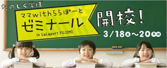 三井ショッピングパーク ららぽーと富士見では、「ママwithららぽーと」の取り組みとして、学校やご家庭とは全く違う、新しい世界をたのしく学べるキッズイベント『ママwithららぽーとゼミナール』を3月18日(土)~3月20日(月・祝)の3日間、開催します。