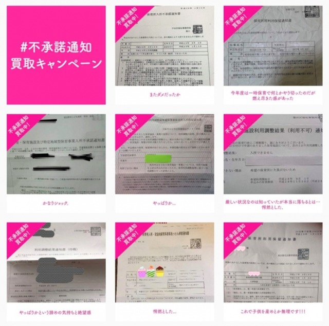 今回買い取ったすべての「不承諾通知」画像は、通知を受けとったときの感想コメントとともに、キッズラインのインスタグラムアカウントにて公開中です。「#世田谷区不承諾通知買取済」「#港区不承諾通知買取済」などのハッシュタグを用いて、地域ごとの買い取り状況を一目でわかるようにしています。(※個人情報は伏せた状態での応募・掲載となっております)