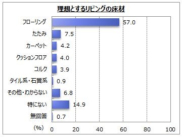 リビングの床がどんな床材だったらよいかを聞いたところ、「フローリング」が57.0%、「たたみ」が7.5%、「カーペット」「クッションフロア」「コルク」が各4%です。現在の床材と同じ床材が理想だと回答した人の比率をみると、フローリング利用者は7割弱、コルク利用者は6割弱と高く、クッションフロア利用者は2割弱と低くなっています。