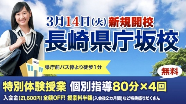 この機会に、新たに仲間入りした「個別指導Axis長崎県庁坂校」をご利用ください。新校舎の見学や学習相談は、いつでも承っております。
