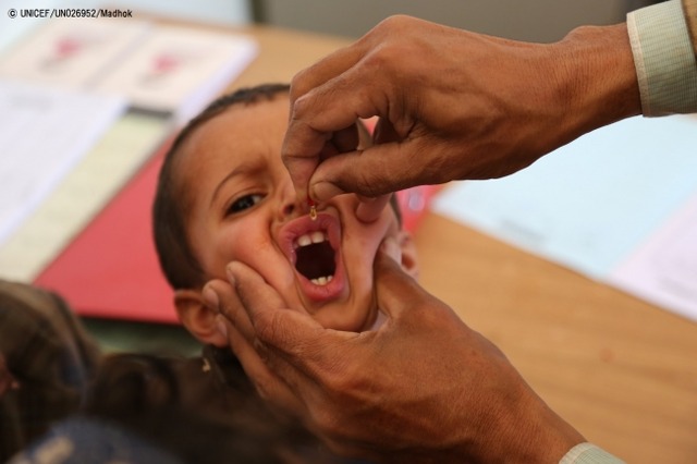 暴力が激化するイエメンで、ユニセフ(国連児童基金)とパートナー団体は、個別訪問による全国規模のポリオ予防接種キャンペーン第一期を終了し、500万人の5歳未満児にポリオの経口ワクチンとビタミンA錠剤を提供することができました。