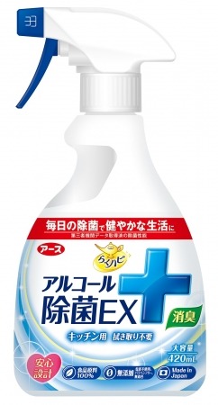 そこで、キッチンや食器類、食卓など、様々なシーンでも安心して使用できる食品原料100%の安心処方で、塩素系成分・パラベン・着色料などを添加しない無添加処方、さらに生産場所にも こだわったアルコール除菌スプレー 『 らくハピ アルコール除菌EX 』 を新発売いたします。