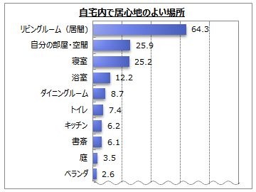 自宅内で居心地のよい場所は、「リビングルーム(居間)」が64.3%、「自分の部屋・空間」「寝室」が各3割弱、「浴室」が1割強となっています。「リビングルーム」は女性や高年代層、「自分の部屋・空間」は若年層で比率が高くなっています。男性20~40代では、「特にない」が10%台で他の層よりやや高くなっています。