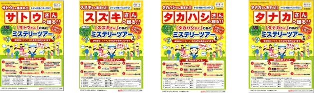 今回のツアーは、特定の苗字の方だけを募集する「ミステリーツアー」の新商品です。日本人の姓で多い「サトウ」さん、「スズキ」さん、「タカハシさん」、「タナカ」さんに限定して、初回のツアーを企画いたしました。通常の「ミステリーツアー」と同様、行き先は当日まで分からないことに加え、「苗字」に関連のあるゆかりの地を巡ったり、バス車内では「苗字」にまつわるクイズなども実施し、同姓のお客様同士、一体感を楽しむ企画となっております。