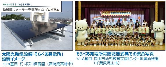 (*1)「そらべあスマイルプロジェクト」:そらべあ基金の活動に賛同する企業・個人からの寄付をもとに、太陽光発電設備「そらべあ発電所」を全国の幼稚園や保育園に寄贈する取組み。「そらべあ発電所」設置により、子どもたちの環境に対する関心を高めることを目的としており、「そらべあ発電所」寄贈先は、全国から希望する幼稚園・保育園を募集し選定します。