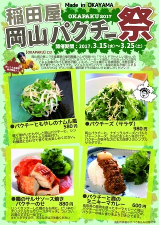 和食居酒屋の「稲田屋」では、岡山産パクチーをふんだんに使った日本酒と合うパクチーメニューを提供いたします。