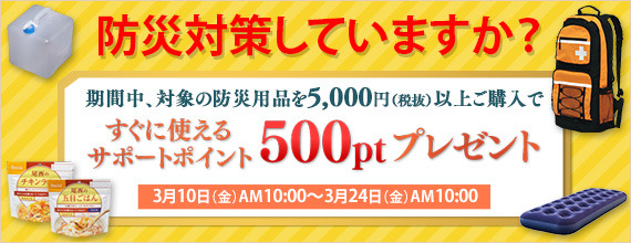 アイリスプラザでは震災を経験した方々の意見を元に、災害時に本当に役立つアイテムを多数ご紹介しております。また、今だけ対象の防災用品を5,000円以上ご購入でアイリスプラザで使える500ポイントを期間限定でプレゼント中です!【~3月24日(金)AM10:00まで】
