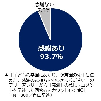今回のアンケートでは、実に9割以上の保護者が、預けている子どもの卒園のタイミングで保育士に対し感謝をしていることがわかりました。中には「とにかくしっかり子どもをサポートしてくれる担任。子ども教育に対し信頼のおける所なので、卒園に当たり、寂しく不安に感じる」と、担任の先生がいなくなることに不安を感じる保護者もいました。ほかにも「長男から足かけ10年以上お世話になり、家庭で躾に時間をとることが難しい中、園に頼りっぱなしでした。本当に感謝の気持ちでいっぱいです」や「赤ちゃんの頃からお世話になり、自分自身もたくさん助けられた」、「保育園のおかげで親も安心して働けた。子育ての悩みを共有できたり、子どもの特性に気づけたりした」など、日々保育士が子どもと保護者に対し、家族以上の存在で向き合っていることがうかがい知れます。卒園の時期は、わが子の成長を感じるとともに、お世話になった保育園や先生方に対して、改めて感謝の想いを強くするタイミングのようです。