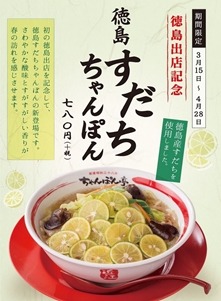 ドリームフーズ株式会社(本社:滋賀県彦根市幸町74-1 代表者:山本英柱)が運営する「ちゃんぽん亭総本家」は、2017年3月15日(水)より徳島県産すだちを使用した「徳島すだちちゃんぽん」を季節商品として限定発売を開始しますのでお知らせします。