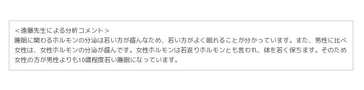 男女別・年代別に睡眠時間を比較すると、年齢が上がるほど、睡眠時間が短くなることが判明しました。男女ともに30代と50代では1日平均25分の睡眠時間の差があることが分かります。また、男女を比較すると女性の方が、睡眠時間が長いことが分かります。