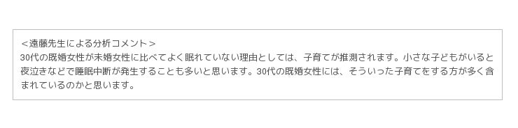 30代の既婚女性の睡眠中断発生率は、30代の未婚女性に比べ高く20%を超えており、よく眠れていないことが分かります。