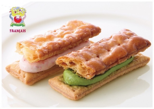 ほのかに香る桜の風味と甘ずっぱい苺の味わいのさくら苺クリームと宇治抹茶を使用した抹茶クリームを幾重にも重ねたサックサクのパイ生地で挟みました。