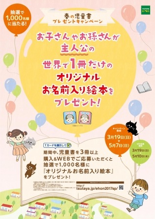 キャンペーン期間中に、全国のTSUTAYA店舗で児童書を合計3冊以上ご購入且つWEBでご応募頂いた方の中から抽選で1,000名様に、主人公の名前をご希望のお名前にできるオリジナル絵本を「世界で1冊だけのオリジナル名前入り絵本」を1冊プレゼント致します。この機会にぜひ、お近くのTSUTAYAまで足を運んでください。