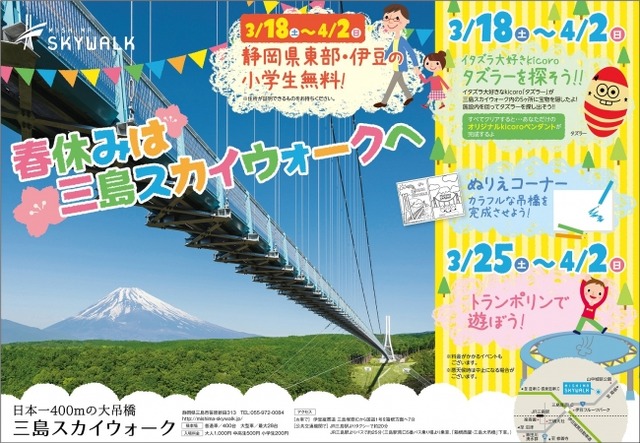三島スカイウォーク(運営:株式会社フジコー、本社:静岡県三島市、代表:宮澤俊二)では、3月18日(土)から4月2日(日)まで、“親子の想い出づくり”を応援する春休みイベントを開催します。本イベントは、施設5か所に隠れているヒントを探して“オリジナルkicoro”を完成させる「イタズラ大好きKicoro タズラーを探せ!!」やトランポリンなどの体験型イベントと、ぬりえコーナーなど親子で楽しめる内容になっています。さらに、期間中、静岡県東部・伊豆地域の小学生は入場無料となります。春休みのお出かけは、三島スカイウォークで“親子の想い出づくり”はいかがでしょうか。