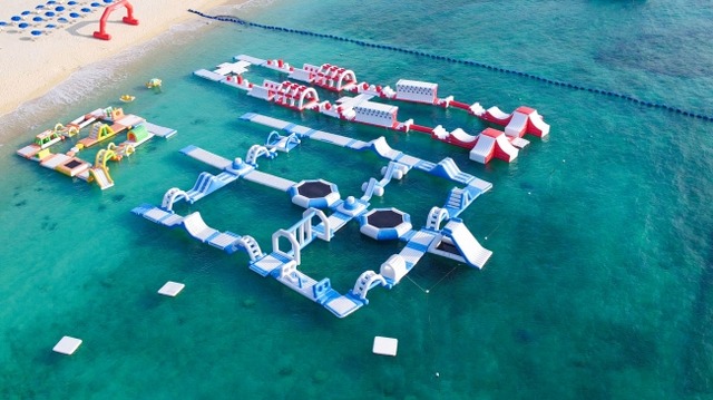 万座ビーチの遊泳区域内にインフレータブル(空気を入れて形状を保つ構造物)を浮かべた、国内最大級の海のアスレチック施設です。景勝地・万座毛を臨む美しい海の上でトランポリンや滑り台、ジャングルジムやブランコなど様々なアトラクションを用意。今年はニンジャエリアも登場しよりアクティブにお楽しみいただけるようになりました。万座ビーチでは2011年より導入し、毎年期間限定で開催している人気メニューです。