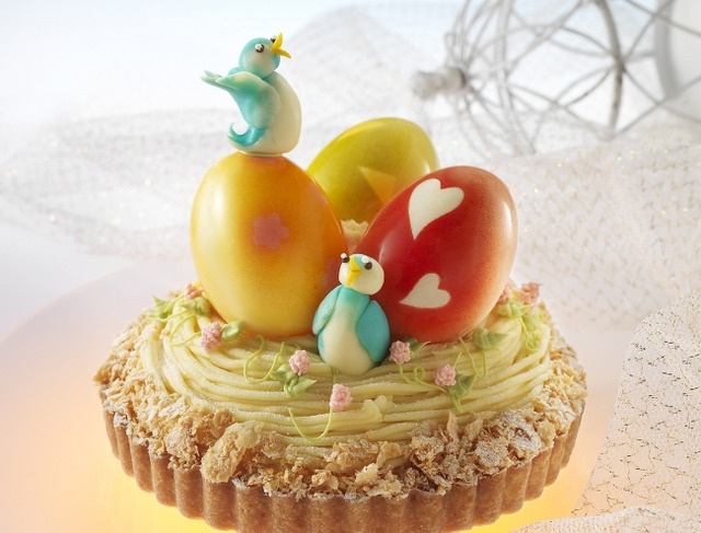 「イースターケーキ」(消費税込 6,480円)は、鮮やかな3色のたまごが目を引くイースター限定スペシャルケーキで、見た目も可愛らしい、お子様から大人の方まで楽しんでいただけるモンブランタルトです。しっとりとしたアーモンドクリームのタルト生地の上に、ホイップクリーム、栗、スポンジをモンブランクリームで閉じ込めました。チョコレートを使って表現したたまごの中には、サクサクした粒状のチョコレート入り。鳥もチョコレートを使って仕上げています。