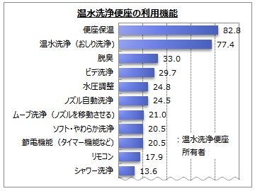 ■温水洗浄便座の所有者は7割強。利用機能は「便座保温」「温水洗浄」が所有者の各8割、「脱臭」「ビデ洗浄」「水圧調整」「ノズル自動洗浄」などが2~3割。高年代層で比率が高いものが多い