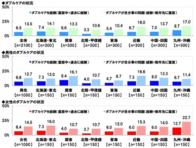 地域別に、「ダブルケアを経験した人」の割合をみると、九州・沖縄が最も高く9.7%と約1割になり、また、「ダブルケアが自分事の問題である人」の割合をみると、九州・沖縄が17.0%で最も高く、次いで、近畿が16.0%と僅差で続きました。