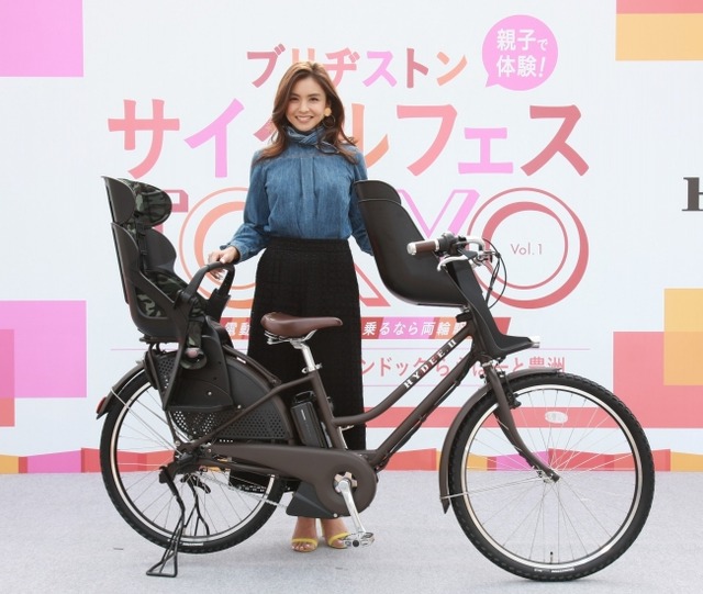 最近は朝5時前に起きて家事とモデル業を両立させているという滝沢さん、この春の流行を取り入れたボウタイブラウスで登場し、「今年の限定モデルのHYDEE.IIは、ダークブラウンと、アイボリーの2色があってみんなに選んでもらいやすいラインナップ。おしゃれに乗るには、自転車のカラーに合わせてモノトーンで仕上げると素敵だと思う」と自転車と合わせたファッションのアドバイスを贈っていました。「自転車で送り迎えをする方も多いと思いますが、うちでは送り迎えもですが、家事はできるほうができるときにやっている。やっぱり仕事と育児の両立は協力が大事」と円満な夫婦生活についても語り、「旦那様はイケダン(イケてるダンナ)ですね!」とMCに語り掛けられ、笑顔を浮かべていました。