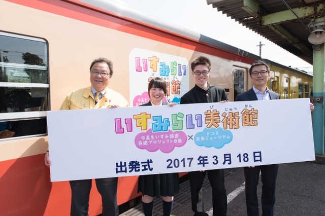 株式会社NTTドコモ(代表取締役社長:吉澤和弘、本社:東京都千代田区、以下NTTドコモ)は、日本最大級の創作絵画コンクール『「ドコモ未来ミュージアム」~みんなの想像力が、未来をつくる。~』(対象3歳以上中学生以下)の15周年を記念し、千葉県大多喜町・いすみ市を走るローカル線「いすみ鉄道」と、それを利用している地域の生徒中心の「中高生いすみ鉄道存続プロジェクト会議」とタッグを組み、子どもたちの描く未来を映像とともに発信する『いすみらい美術館』列車の出発式を、3月18日(土)に大原駅(千葉県いすみ市)で開催しました。